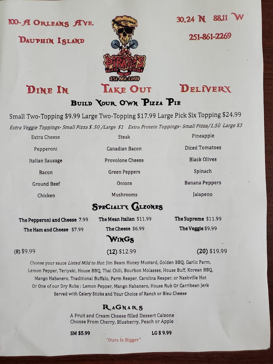Welcome to Pirate's Pizza and Wings, a culinary treasure nestled at 1610 Bienville Blvd, Dauphin Island, AL 36528. This gem of a restaurant has quickly become a favorite among locals and visitors alike, renowned for its exceptional pizza and calzones that offer a delightful reprieve from the typical seafood fare of the Gulf Coast.